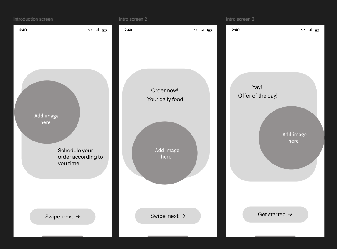 Welcome to the introduction screen. The purpose of the introduction screen is to get a quick idea about the content of our application. The introduction screen makes the customer feel welcomed. It highlights the unique feature of our application, as you can see in the above images we have highlighted the unique features that our application has and now after swiping to the last slide of the introduction you can see the "Get started" button to move to the login page.