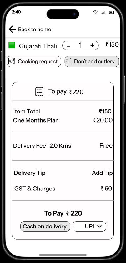 This is the cart screen. This screen shows the name of the dish, total amount to pay, quantity (customer can modify the quantity from here also), they can add cooking request and also there is an option for cutlery. The buttons which are highlighted in a bit darker shade shows that a customer has opt for that particular thing. For billing customer can make a payment through cash or by using UPI account.