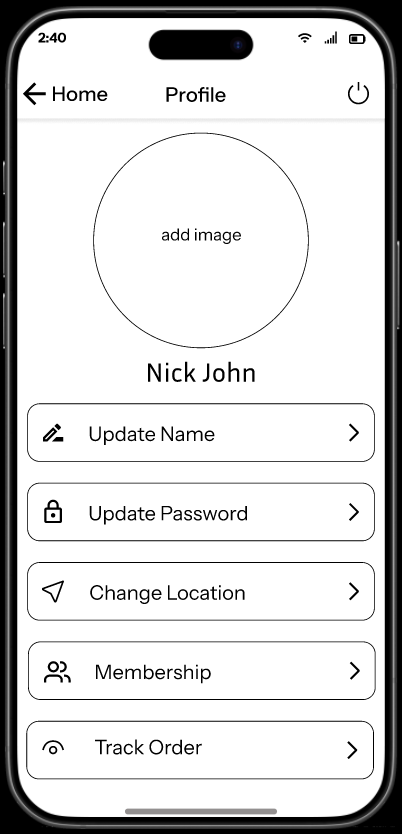 This is the Profile screen. Here, customers can update their name, password, membership details, track order and location. They can also change their profile picture and log out of their account directly from this screen.