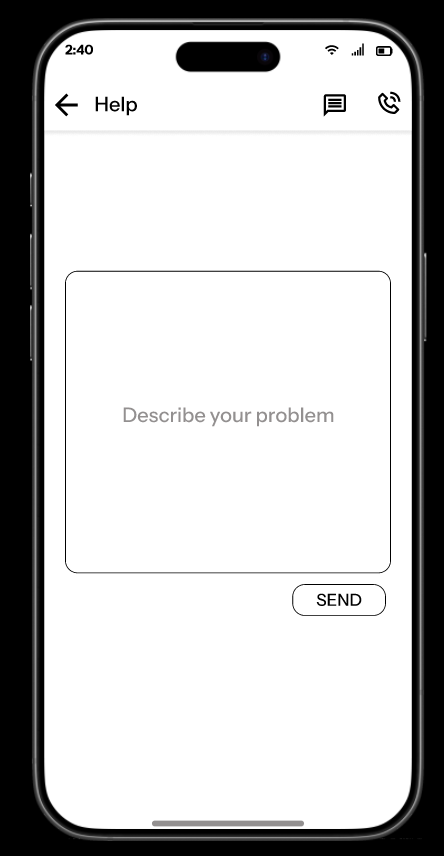 This screen is for help and support. It allows customers to share their problems or any queries they may have. They can connect with us through a message or a call. Our team is here to make sure customer's experience stays smooth.