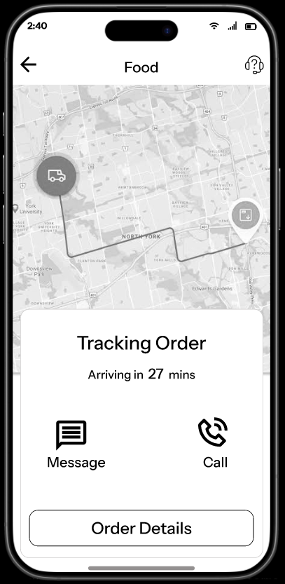 This screen is about tracking the order. Customers can see where the order is. This helps customers to track the live status of their order and how much time is left for delivery. Here, customers can also make a call or drop a message to get information about their order. It also has a support icon which will re-direct you to the support screen.