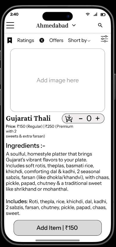 This screen is about product detail. It shows details like price, ingredients, and an image of the food. It also has options like add item and choose the quantity. It helps customers to understand easily what they are ordering and check all the details about the food before ordering it.